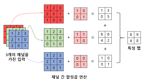 *다수의 채널을 가질 경우 (3차원 텐서의 경우)에는 각 채널을 채널간 합성곱 연산을 실시하여 모두 더한다.