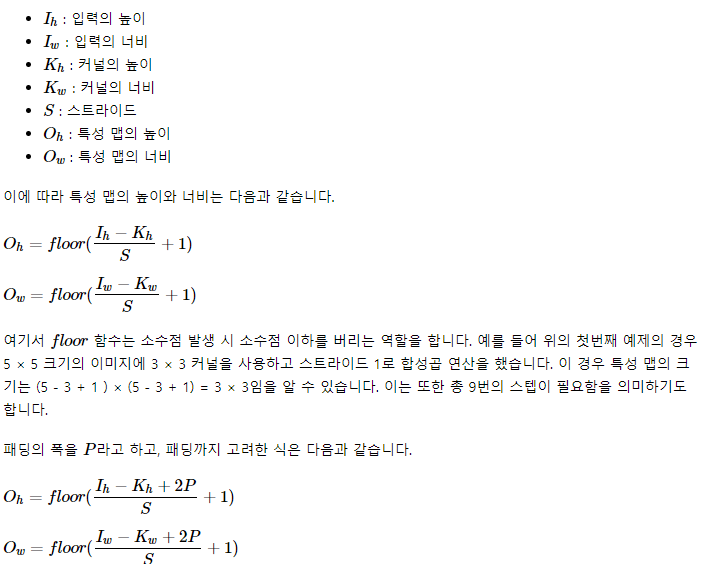 - 특성 맵은 커널의 크기와 스트라이드에 따라 달라질 수 있는데, 패딩을 하면 입력의 크기와 동일하게 유지할 수도 있다.