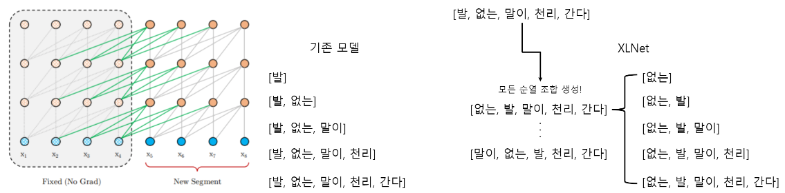 -기존 모델은 원본 문장의 이전 단어에 대해 다음 단어 하나를 예측했다면, XLNet은 입력 문장의 토큰들을 순열 조합을