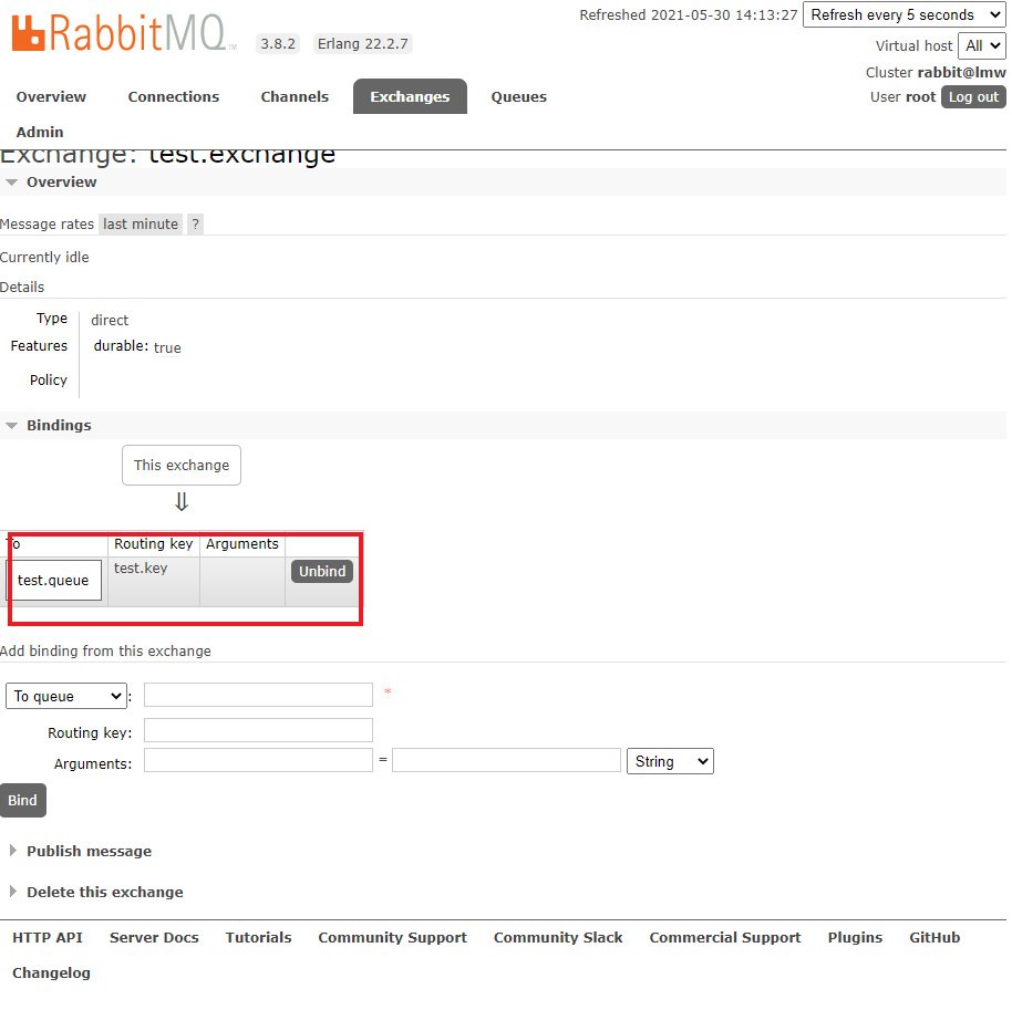 아까 만든 test.exchange Exchange로 들어가 방금 만든 큐를 Binding 해준다.