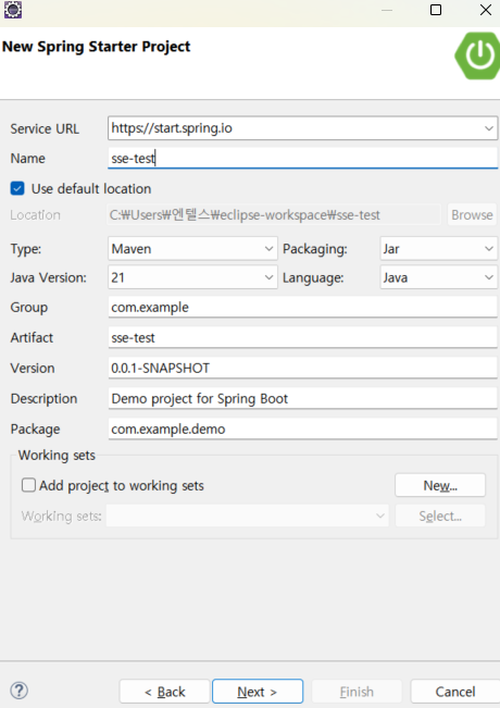 SSE는 org.springframework.web.servlet.mvc.method.annotation 안에 있기 때문에 Spring Web을 추가해서 프로젝트를 생성해야 한다.